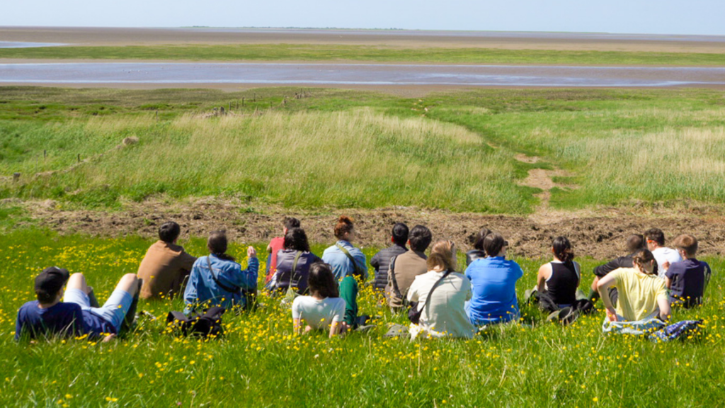 Senere samledes alle de studerende til forskellige øvelser på vaden og strandengen, hvor de blev opfordret til at gå sammen og opleve nærhed og ro i fællesskab. Øvelserne kulminerede i det smukke solskinsvejr med en stille stund med lukkede øjne, hvor deltagerne kunne lytte til naturens lyde og udforske dyrelivet i området.